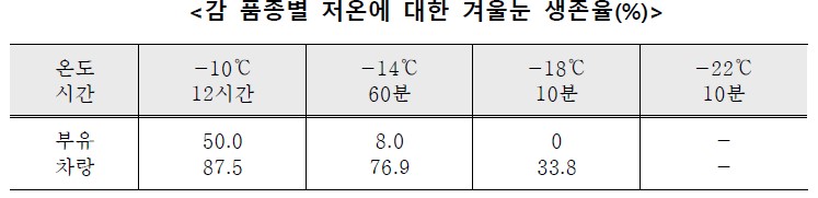 ○ -20℃ 이하에서는 대부분의 가지와 눈은 동사하고, 원줄기도 30% 이상 동사