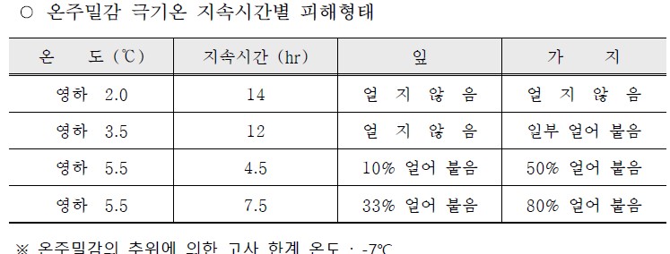 ○ 온주밀감인 경우 -5℃가 되면 잎이 말라죽거나 낙엽이 되며, -5.5℃가 수 시간 지속되면 동해에 의한 낙엽이나 가지가 마르고 죽게 됨